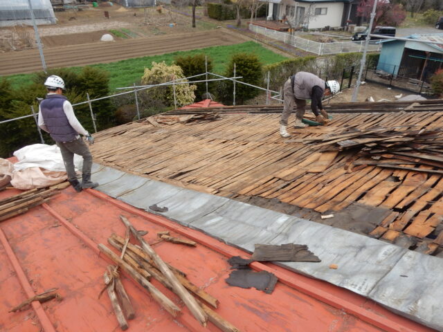 既存のトタン屋根を解体するとともに劣化した下地材も撤去していきます。